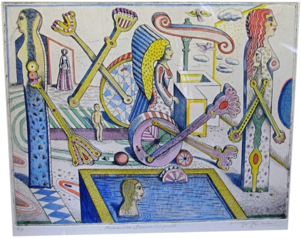 "Mechanisches Brunnenlabyrinth" - 1993 Radierung handkoloriert