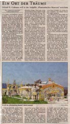 Haltung einnimmt! ![]() Finanzierung: Da das Projekt erst kürzlich der Öffentlichkeit, den Künstlern und Interessenten vorgestellt wurde, kann erst über seinen Standort informiert werden, wenn die Art der Finanzierung durch einen oder mehrere Sponsoren feststeht, die z.B. die Patenschaft (bez. Stiftung) für das Museum oder Teile des Museums übernehmen. Durch seine Konzeption und seine Ausstellungen sollte das Museum sich möglichst selbst finanzieren. Kostenberechnung: Museumsgebäude mit Heizung, Elektrik, Erschließung, Wege, Kanal usw. (ohne Nymphäum, künstlerische Ausgestaltung und Grundstückskosten) belaufen sich auf ca. 800 500 .− Euro ; Die Gesamtkosten dürften sich auf 2-3 Millionen Euro belaufen. Ausstellungen: Die Ausstellungen sind der phantastischen, visionären, neomanieristischen, figurativ- symbolistischen und surrealistischen Kunst vorbehalten. Ebenso sollten Fantasy − Kunst, Kunstrichtungen wie die art-brut ein Forum bekommen. Zwei große internationale Ausstellungen sollen pro Jahr gezeigt werden. Diese Ausstellungen können im Austausch mit anderen Phantastischen Museen stattfinden und sollen sowohl das regionale wie überregionale Publikum ansprechen. Das Museum ist von Ende März bis Mitte November geöffnet und über den Winter geschlossen. In den Wintermonaten, und zwischen den Ausstellungen kann das Gebäude für andere Veranstaltungen angemietet werden. Phantastische Architektur: Vobilder, dass ein Phantastisches Museum nicht nur ein „Luftschloß” bleiben muß, möchte ich am Beispiel anderer phant. Architekturprojekte zeigen, die bereits realisiert worden sind. 1. Das „Palais idéal” des Briefträgers Ferdinand Cheval (1879 − 1912) gehört zu den bedeutendsten phant. Architekturen. Der „Stein des Anstoßes” für diesen Bau − war ein bizarr − figurativ geformter Stein, den Cheval gefunden hatte. Dieser Stein weckte in Cheval einen Traum von einem idealen Palast, den er in 35 Jahren in seinem Garten aus gefundenen Steinen und Beton errichtete. Er ist nicht bewohnbar, sondern nur begehbar. Diese Architektur, die keinen praktischen Zweck besitzt, ist nur für ein optisches Erleben gedacht. Hauterives ist ein kleines abgelegenes Dorf bei Lyon. Das Bauwerk wird an den Wochenenden von bis zu 2000 Besuchern besichtigt. 2. Niki de St. Phalle (1930* − 2002) realisierte in der südl. Toskana einen Tarot - Garten mit gigantischen, phantastischen Figuren, die bewohn-bar sind. Mit Hilfe einer Parfümfabrik, für die sie Flakon entwarf, konnte sie diesen Skulpturenpark realisieren, der inzwischen weltweit Beachtung gefunden hat und der von vielen Toskanabesuchern besichtigt wird. 3. Robert Tatin (1902 − 1983) kaufte sich bei Le Mans (Bretagne) ein her −untergekommenes Bauernhaus, an das er 1962 eine phantastische Architektur (Innenhof, Figurenallee, Ausstellungshalle usw. ) anbaute. Inzwischen hat die Kommune das Gebäude übernommen, den Park erweitert, einen großen Parkplatz und einen Empfangspavillon mit Videoraum errichtet. 4. Bruno Weber (1931*) errichtete bei Dietikon /Zürich zuerst ein bizarres Atelierhaus, dem im Laufe der Jahre weitere phant. Gebäude und gigantische Fabelwesen aus Beton folgten. Mit Hilfe von bis zu 8 Mitarbeitern und verschiedener Sponsoren realisiert Bruno Weber auf einem Gelände von ca. 15.000 qm einen einzigartigen, wundervollen Traum. An Wochenenden kommen bis zu 2000 Besucher. Weitere phantastische Architekturen, oder Häuser phantastischer Künstler befinden sich in Wien, wie das Hunderwasser − Haus, Museum Ernst Fuchs, Figueras Dali- Museum, Belgien Paul Delvaux- Museum usw. „Die Kunst wird bald verschwinden. Sie ist bereits auf so minimalen Ausdruck reduziert worden, dass jeder weitere Schritt ihren gänzlichen Untergang bedeuten würde. Dann wird die Architektur ihren Platz einnehmen. Und innerhalb der Architektur wird sich schließlich mittels der Ornamentik ihre Rückkehr vollziehen.” |